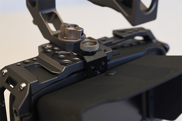 写真は他社製のEVFホルダーを使用しているが、TILTA製もある。EVF Holder Kit for ESR-T01-A cage with Rod(ESR-EHT01)32,238円