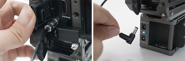 NPバッテリーは2種類のプレートがある。ケージの上に乗せるか、ケージの下に装着するか、の違いだ。Vバッテリープレートはケージの下に装着するタイプ。その上でバッテリープレートからBMPCC 4Kにケーブルをつなぎ、給電する。