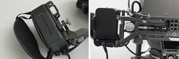 NPバッテリーモデルの特徴は厚みがあることとSSDホルダーを兼ねていること。あとは同じで、ギアへの電源供給と12V Micro DCケーブルを使ってカメラヘ給電が可能になる