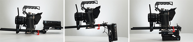 シネ運用をする際は、カメラの底部に15mmロッドを2本装着するのが基本形だと思うが、前述のカメラの下部に装着するVバッテリープレートは構造上の問題で装着ができない。そのため、基本形のBasicPackageに15mm LWS Baseplate(TA-BSP-15-G)を装着することから始まる。装着は簡単。横からスライドするだけだ。ベースプレートに一対の15mmロッドを入れる。