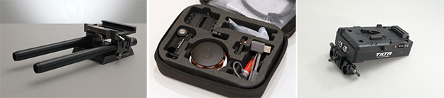 昨年のInterBEEでご覧になった方も多いかもしれないが、TILTAのBMPCC 4K用ケージはまさにフルアーマーという名がふさわしく、ケージ、トップハンドル、サンフード、フォローフォーカス、サイドハンドル、SSDホルダー、バッテリーまで用途に合わせて一体化されたデザインを組む事ができる。実際、全てではないが、構成するアイテムを並べてみるとかなりの量になる。