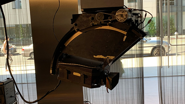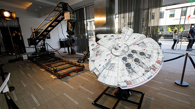 中に入ると、ロビーには、なんと!「スター・ウォーズ エピソード4/新たなる希望」のために開発されたモーションコントロール・カメラ「ダイクストラ・フレックス」の実物と、ミレニアム・ファルコン号の巨大な撮影用模型が展示されていた。