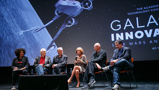 © A.M.P.A.S. 前日に行われた講演会の模様から左から、キリ・ハート(ルーカスフィルム副社長)、リチャード・エドランド、ジョン・ダイクストラ、マーシア・ルーカス、デニス・ミューレン、ジョン・ノールの各氏