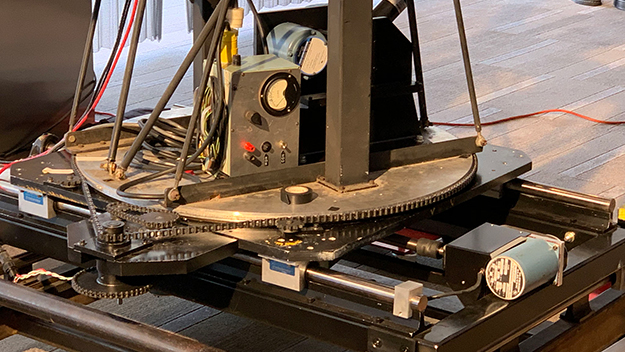 同期した12個のステッピング・モーターをプログラムでコントロール可能で、トラック、ティルト、パン、ロール等の動きと、同じ動作を何度でも繰り返す事が出来ました。このシステムはカスタム・デザインで、長いケーブルがついたデジタル・コントローラーを両手で持って、コントロールしていました。今のようにパソコンが普及する前の時代です。