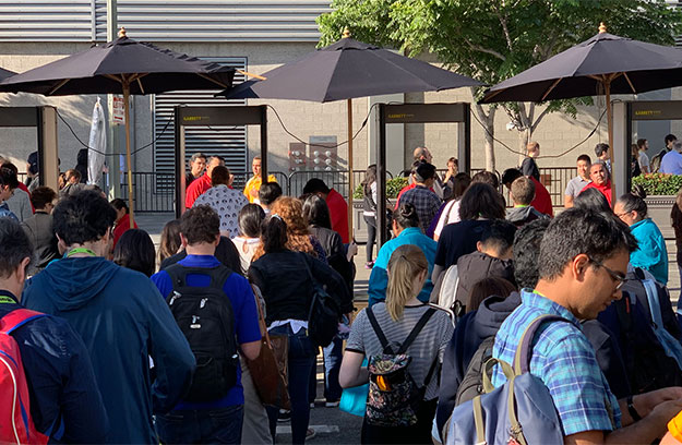 コンベンション・センターから隣接するL.A.ライブへ向かう通路には、セキュリティ・チェックが設けられ、長い列が出来ていた