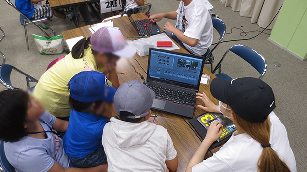 三日目は終わらなかった撮影を済ませて編集。動画編集用のノートパソコンではないが解像度を落として撮影していたのであまり不自由は感じなかった。編集ソフトはVEGAS Proを使用。子供達は編集に興味津々だが、あまり馴れていなく作業の多くは大学生が担い、完成した作品は子供達の家族の前で上映。「人に見せる」映像を創った子供達は興奮が収まらないようだった。