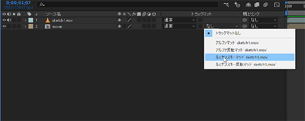Sketch1をmovieレイヤーの上に置いて、movieレイヤーのトラックマットをルミナンスキーマットにします。