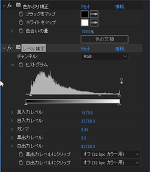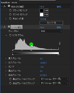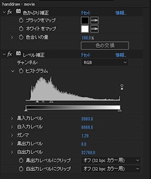 その後、movieレイヤーを複製して、複製したレイヤーに入ってる輪郭検出を消し[レベル補正]エフェクトを適用します。ハイライトを飛ばして黒部分を強くするイメージで調整します。
