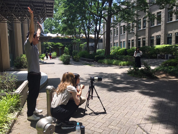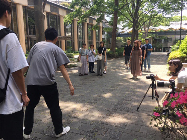 大学構内での撮影。みなはじめての経験だが、監督は大きな身振りで一生懸命役者(ゼミ生)を動かす