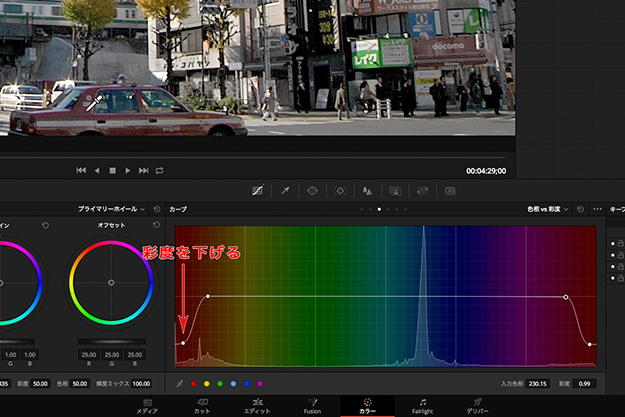 (01)最初にカーブツールの色相vs彩度を使って、ターゲットの明るいオレンジと暗いオレンジの2箇所を抽出し、そのレッド~オレンジ領域の彩度を下げる。画面右側のオレンジ色の看板もターゲットと同様に彩度が下がってしまうことが分かる(図01-01)。