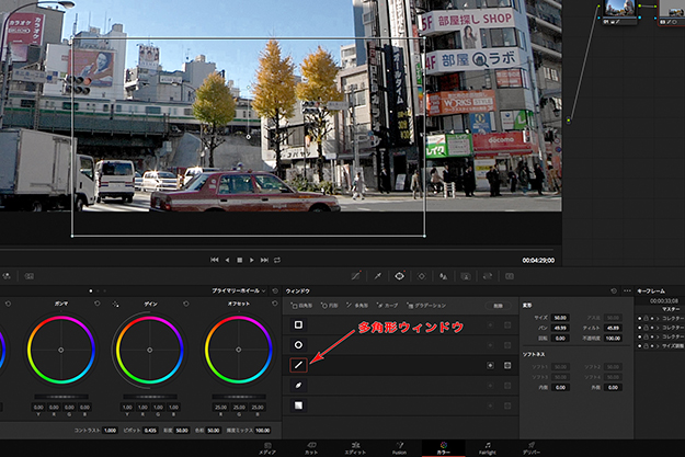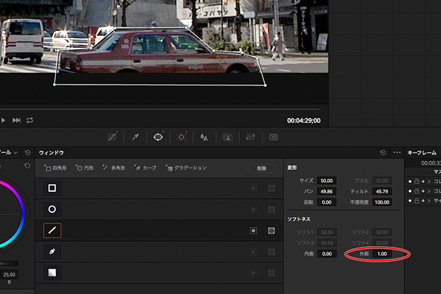 選択範囲を四角形や円形、多角形などで作るウィンドウツール(以下:ウィンドウ)。このウィンドウをカラー調整するターゲットの動きに沿って移動させたい。しかもそのターゲットは、カメラに近づいてくるので徐々に大きくなったりする…。