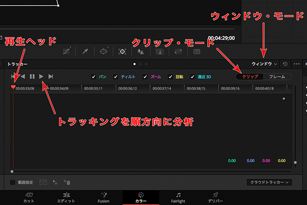 (03)さらにトラッカーパネルに切り換える。「ウィンドウモード」の「クリップモード」になっていることを確認してから、クリップの先頭に再生ヘッドを移動し、トラッキングを順方向に分析(▶︎印)する(デフォルトでは「クリップモード」になっている。図01-04)。