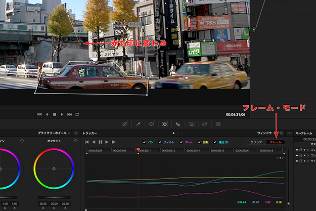 手動でのキーフレーム追加には、最初は戸惑うかもしれないが、2~3例の実習でコツがつかめるはずだ。サンプルムービーには、今回ターゲットのオレンジ色タクシーの他にも、黄色いワンボックス車両という格好のターゲットも写っている。