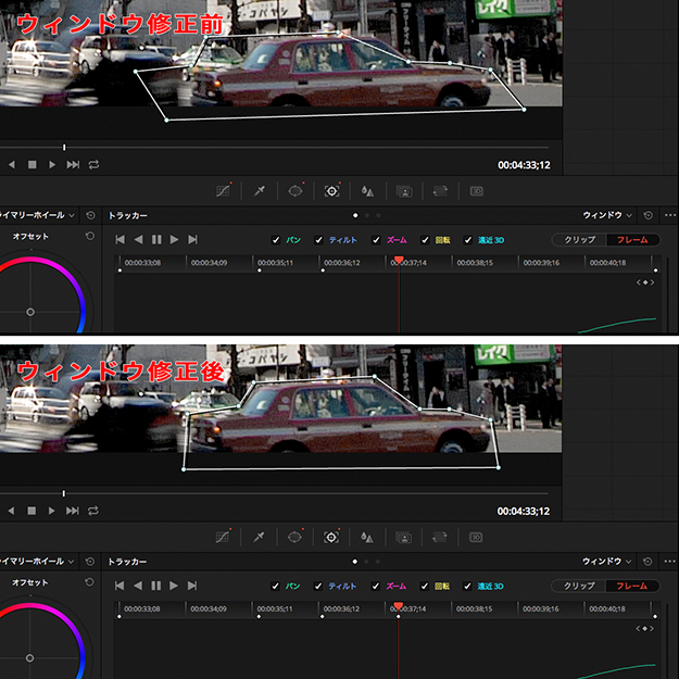 (06)再生ヘッドを進めて行くと、黄色車両とのすれ違い“直後”にウィンドウが変形してしまったことがわかる。このフレームでもこれまでと同様にウィンドウの各ポイントを修正することで、キーフレームが追加される(図01-07)。