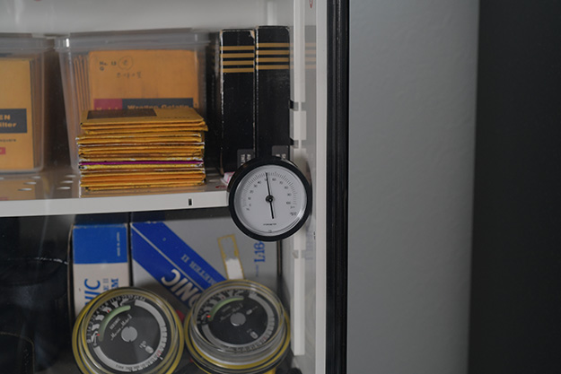 一番困ったのは、アナログ湿度計とデジタル湿度計の表示が違うことで、どちらを信用していいか判断できませんでした。そこで、デジタル防湿庫にアナログ湿度計を入れて、他と比べたところ、アナログ湿度計の表示は平均して揃っていますので、アナログを基準に湿度調整しています。