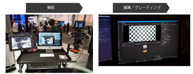 1つは現場でのメリットは、ディストーション補正情報によって後から歪んでいるものを真っ直ぐにデジタル補正で確認できること(上記図左の「撮影工程」参照)。これにより、広角撮影の際に現場で「これだけ画角が狭くなる」というのをモニターで確認できるという。