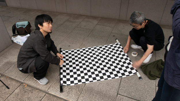 幕張ベイタウンの撮影現場より。グリッドの撮影の準備をする足立氏と脇坂氏
