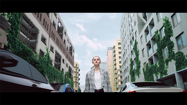歩く女性の背景で、次々と形を変えていく建物群。カメラが動き回るカットは28mmのワイドレンズで撮影