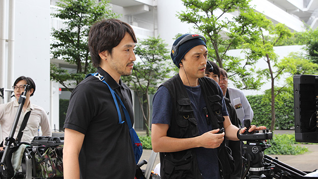 幕張ベイタウンで行われた実写映像の撮影現場より。モニターを確認する江夏氏とカメラをコントロールする渡辺氏