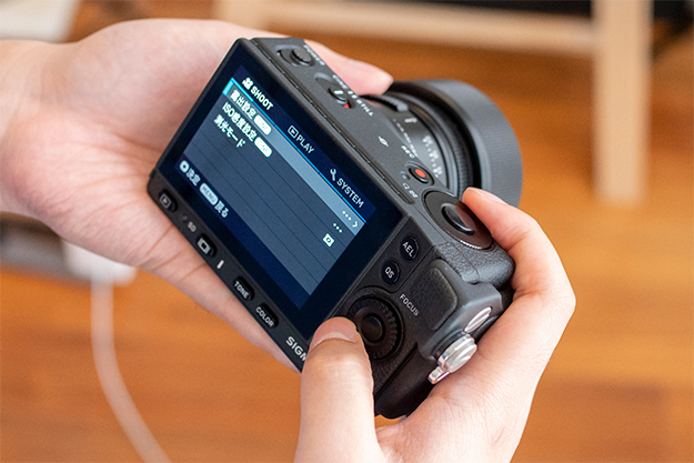 ジョイスティックこそ備わっていないが、一般的なミラーレス機と同じくグリップを握った右手の人差し指と親指で操作できる2つのダイヤルがあるので、メニュー操作もストレスなく操作できた(ボディ上面のダイヤルで横方向へ、ボディ背面のダイヤルで縦方向へ移動)。ただシャッタースピードやアイリス等の操作はデフォルトだと無効になっているので、メニューの中の「ダイヤル露出操作」を「入」にする必要がある。