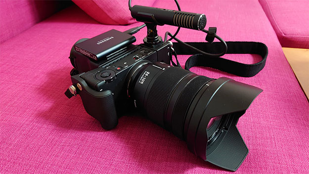 動画運用の最低限のスタイルはこんな感じだろうか?「HU-11(付属)」「LVF-11」そして「Samsung T5」に適当なガンマイクを合わせた形だ。ガンマイクはfpの本体内収録よりも収録機能付きの方が現実的かも知れない