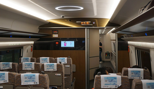 日本から深センに行くためには、深セン空港まで成田から直行便もあるが便数も少なく、値段が高めなので、すぐ隣の香港まで飛んでから、フェリー、MTR、新幹線、バスなどで深センに入る人が多いのではないだろうか。新幹線の場合は香港からわずか20分ほどで行くことができる。車両は特に中国側の新型車両は非常に新しく、デザイン性も優れている。車内には連結部分と車両中央の通路の天井にディスプレイがあり、広告媒体として利用されている。