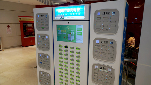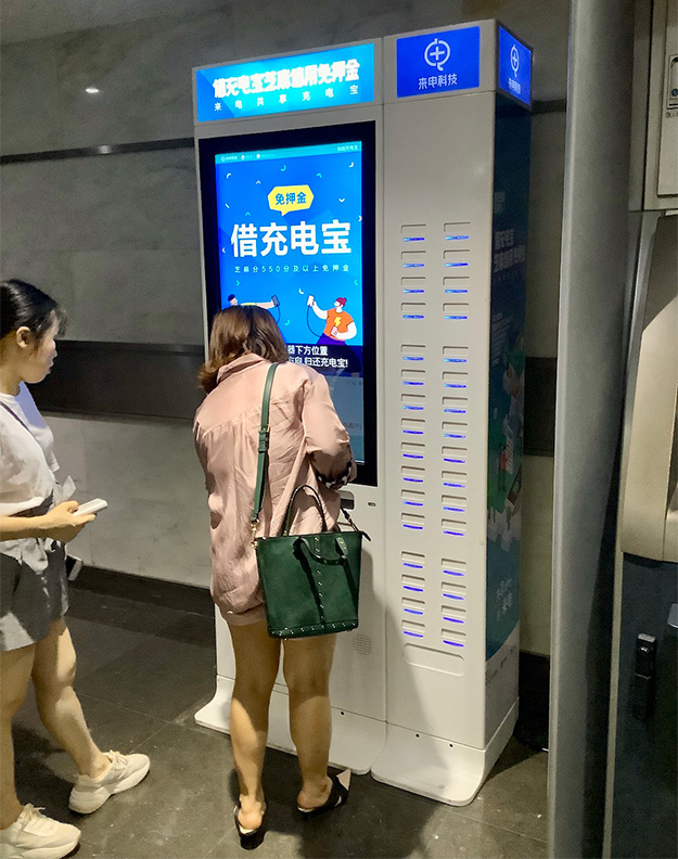 あまりデジタルサイネージとして積極的に媒体化はされていないが、ショッピングモールなどにはこうしたモバイルバッテリーのレンタル機が複数の事業社によって運営されている。その利用率は結構高いことに驚く。