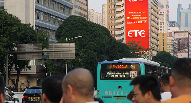 世界で初めて見たのがバスのサイネージである。もちろんバス車内のサイネージは珍しくないが、深センのバスの一部には、後部の窓にLEDディスプレイが付いていて広告を表示するものが走っている。さらに続きはスマホでということで、QRコードまで表示するものが多い。