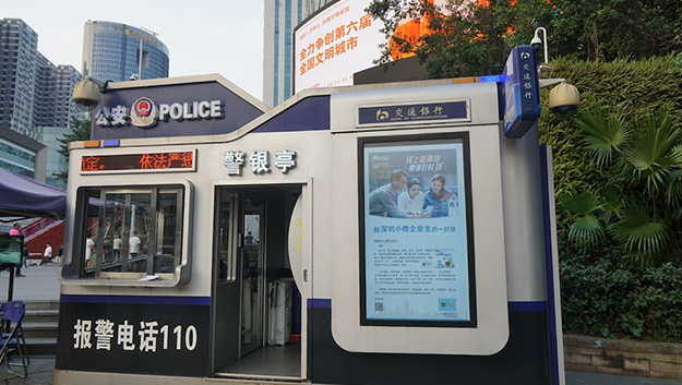 深セン市内の3カ所で見かけた例だが、大きな交差点に「公安 POLICE」と書かれた交番のようなものがあり、中には警官が詰めている。その横に交通銀行のATMがあって、大きなディスプレイで交通銀行の金融商品と思われるもの広告を表示していた。現場でもネットでもこれに関する情報を見つけることができていない。