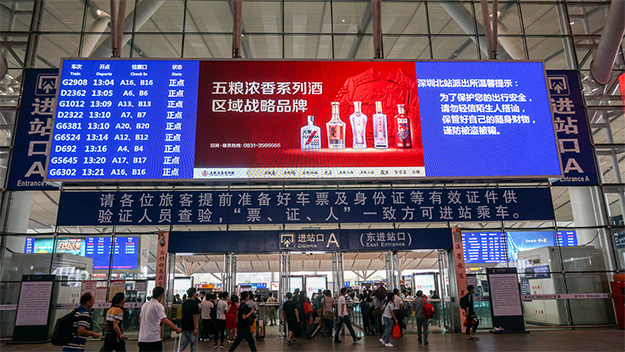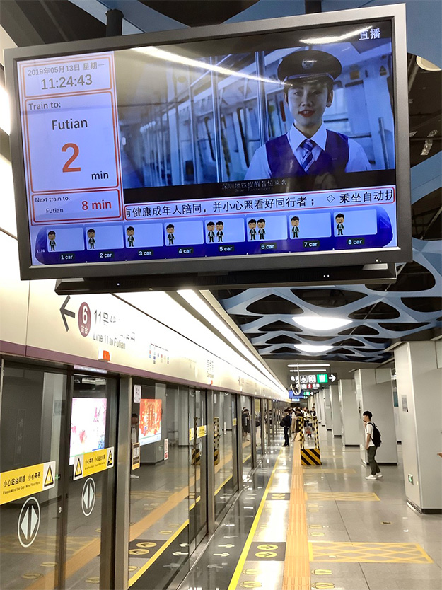 深セン北駅には、昨年9月に香港までつながった新幹線の駅がある。中国らしい巨大空間を有する駅舎があり、壁面にはこれまた巨大なLEDディスプレイが設置されていて、列車の発車案内と広告が表示されている。600インチ以上、いや、もっと大きいのではないだろうか。目新しさはないが、ひたすら巨大である。