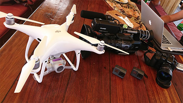GH5は当時最新のミラーレス一眼カメラで、その他の機材は発売から大体1年程度経過した実績のある物ばかりだ。今回のロケは、陸はもちろん、海からも空からも攻める!