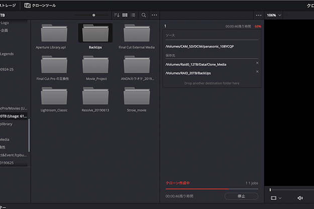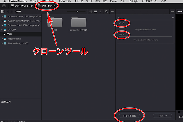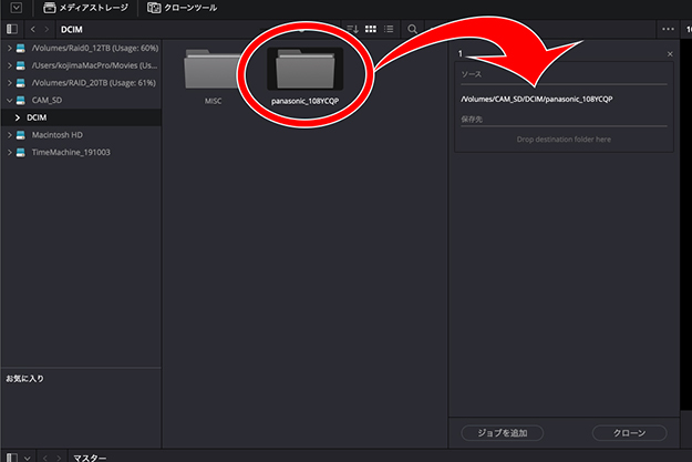 (02)このクローンパネルの左側がメディアブラウザだ。最初に、コピー元であるオリジナルファイルが入っているボリューム(SSDやSDカードなど)、またはフォルダをメディアブラウザから選び出して「ソース:Drop source folder here」と書かれている文字列にドラッグ&ドロップする。