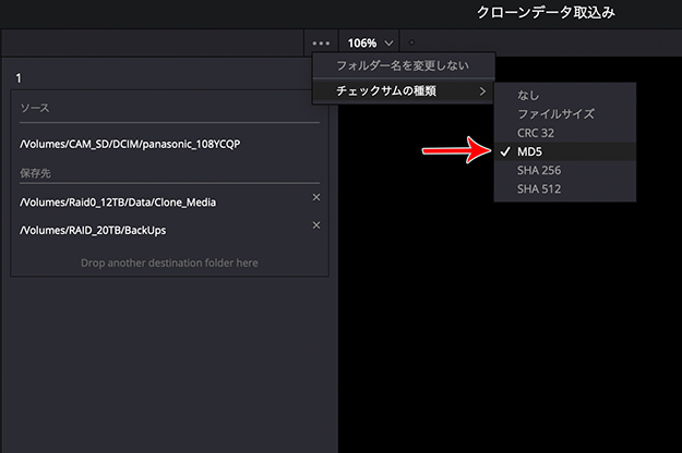 (04)コピー元のソースと、コピー先の保存先が決まったら、次は「チェックサムの種類」を選ぶ。クローンツール・パネル右上のメニューを開くとチェックサムの種類として次の6項目が表示される(図02-04)。