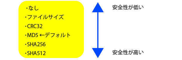 各チェックサムの詳しい検証法の理屈は文章量の関係で割愛するが、下段に行くほどコピー速度は遅くなるが、検証が精密になり安全性は高くなる。