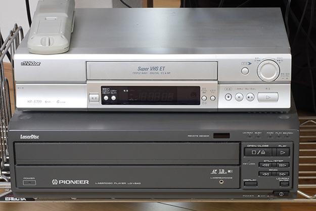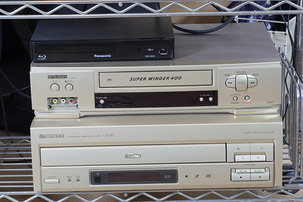 写真10:上から、ブルーレイプレーヤー、VHSレコーダー、レーザーディスクプレーヤー
