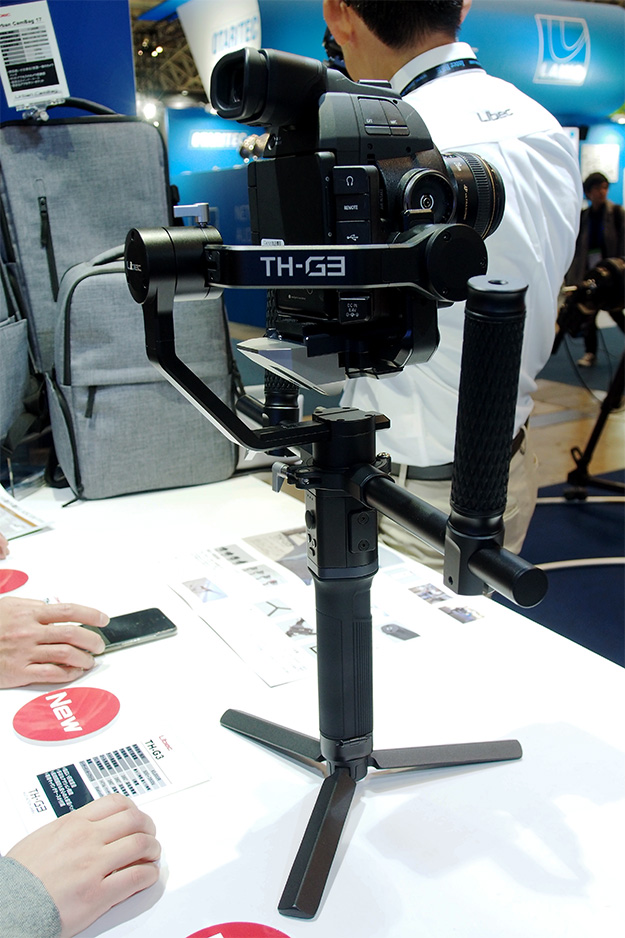 やや大きい筐体はその分モーターのトルクも大きくペイロードは3.6kg、連続稼働時間18時間(ペイロード重量による)は少し大きめのカメラでも対応可能だ。ペイロードに関してはDJI製と比べて異論を唱える方もいるが、まずは市場に出て現場でどう使うのか?で良いと思う。写真ではC100 Mark IIが載っている。このカメラだとどうしても前荷重でバランスが取り難いが、TH-G3はカウンターウェイトを綺麗に搭載する事でバランスを得ている。その加工精度もパーツマニアならほれぼれしてしまうはず。デモ機待ちの1台だ。