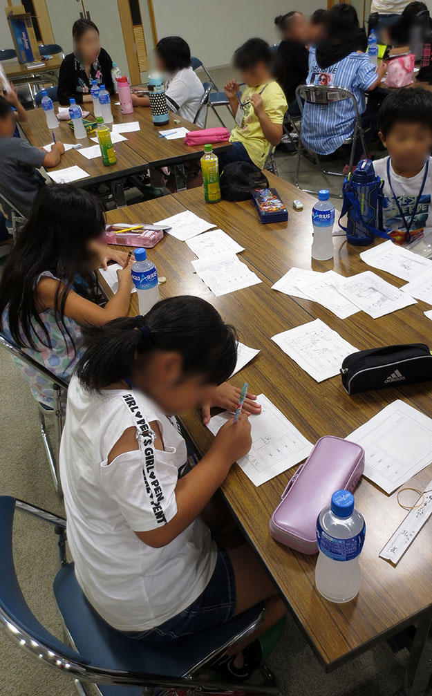 今年度は普段は秋から始まる川崎市の小学校からの提案で、夏休み前に一度、映像の基本と監督や撮影、録音などの各役割説明と、夏休みの宿題である物語のつくり方の授業から始まった。