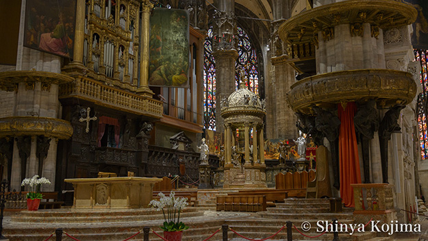 (01)オリジナル画像(図02-01/ダウンロード可)は、ややアンバーに転んでいるものの鉢植えの葉のグリーン、そしてステンドグラスのブルーや紫もほぼ正しく発色している。