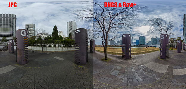 同一ポジションで撮影したJPGの撮って出し静止画像と、DNG8&RAW+による画像を比較した作例。後者では、ダイナミックレンジを広く取ることができ、暗部と明部のディティールが引き出されて、ノイズも低減している。RAW現像はAdobe Lightroom Classicによる