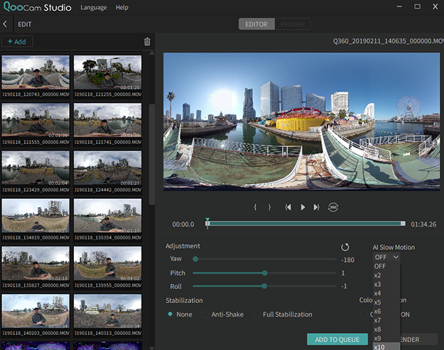 QooCam StudioのインターフェースとAI Slow Motionの設定
