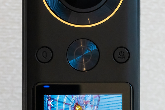レンズの配置はコンシューマー機では、もはや定番のデュアルフィッシュアイが、フロントとリアで背中合わせに配置されている。フロントのレンズの下には、右から電源ボタン、中央がシャッターボタン、左には使用する頻度が高い設定をカスタムセッティングしてプリセットとして保存し、利用することが可能なQボタンが配置されている。