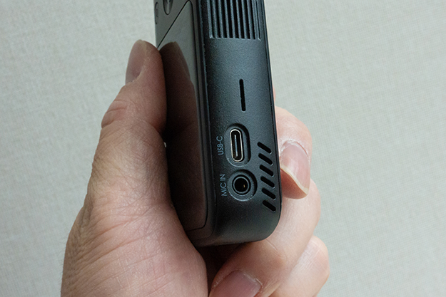 本体の側面に設置されたスピーカー(上)と、USB Type-Cの接続口(真ん中)、3.5mmのマイクポート(下)と、放熱口(右)