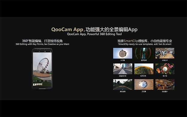 ただし、スマホからの書き出しは、デバイスのスペックの限界から現状最大4Kまでだ。QooCam App「Smart Crip」の中には様々な動画用テンプレートが用意されているので、面白いエフェクトを用いて、手軽に洒落たフッテージを制作し、SNSなどで披露するといった目的にも利用できる。