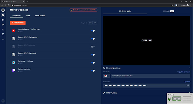 結果的に、私たちUstTodayは現在、ZoomのProプラン(2,000円/月)とRestreamのProfessionalプラン(49USD・約5,600円/月)を組み合わせることによって、YouTube Live・Periscope・Twitch・ツイキャス・Facebook Live、5つの同時ライブ配信を実現することができています。