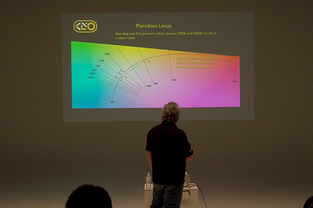 まず今回は照明に関する初歩的なことを展開したいと思う。光に詳しい照明部の方は元より、撮影監督やシネマトグラファーの方々には物足りない内容かもしれない。今回のワークショップはLEDライトの特性とその使い方をメインとし、数あるLEDライト中で何故キノフロのLEDは優れているのか?という着地地点に行く話をほぼ90分の中で順を追って説明があり、色のスペクトラムからその数値の話まで照明はほとんど素人の筆者にしては何となく「なるほど…」というニュアンスで追っかけるのが精一杯だったが、その中で一つだけ自分の仕事の中でも役立つものがあった。