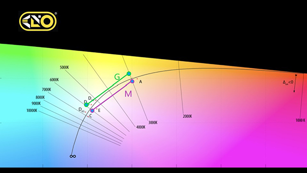 このカーブの部分にいかに光を乗せるかによってそのLEDライトの特色がわかってくる。白色LEDが出た時はその素子だけで白を出していたが、それだけでは先に書いたCRIの数値はこのカーブに沿うことができず、G寄りだったりM寄りだったりする。それが初期の頃のLEDでよく言われていた「まだまだ使い物にならない」という部分だ。しかし今は2色のLEDを使うことによりその直線的だったがその曲線に沿うものとなってきた。もちろんそれだけではまだ足りず、この資料の様に1つのライトパネルのブロックに色々な色を混ぜることにより直線的だった数値が多角形的に曲線に沿うことができる。