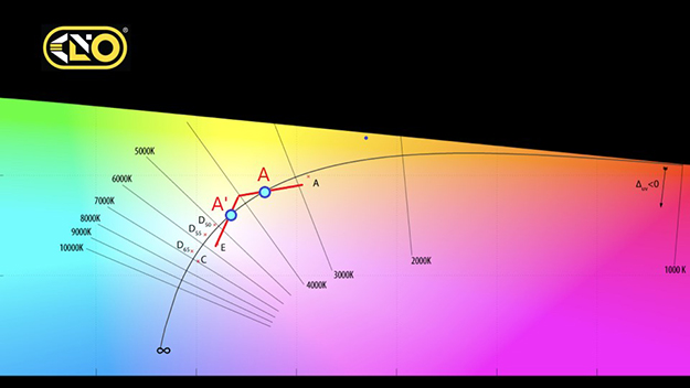 例えばLED 2色でCRI95、3000K~6500Kまで変化できるライトがあるとして、その数値に乗るのはA又はA’の部分となり、その他の部分はその数値が低くなる。つまりこの図で判断すると、このライトの美味しいポイントは3800K辺りと4800K辺りの2か所という感じだ。逆に言えば3200Kや6000K付近の演色は完全にMに転がってしまってこれを補正するためにはCCフィルターを入れなければならない。このポイントの数を多くするためにはキノフロの様な性能の良いLEDライトを購入するのが手っ取り早い。