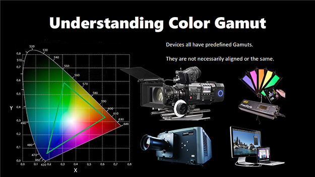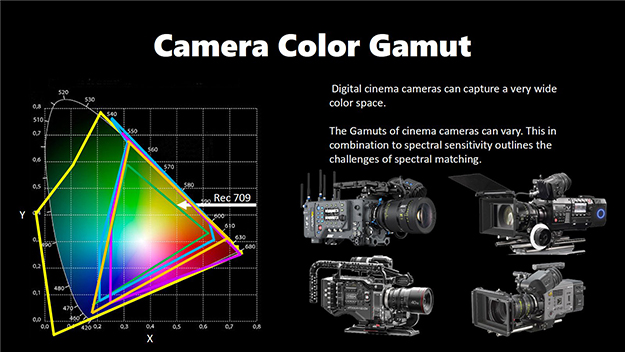 最後に面白い話だったのは、カメラのカラーガンマの話。幾ら色域が広く性能の良いLEDライトがあってもそれを受け止めるカメラとの相性が悪ければ折角各々の調整が良くてもマッチングが取れない。この図はRec.709とその周りのビデオカラーガンマの対比になるが各々のラインがどのメーカーからかはわからないが、キノフロのワークショップと言うことを考えればENG系ではなく制作系のカメラということが想像できる。