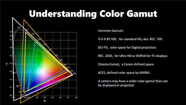 最近は4K収録のためなのかこのカラースペースとそれにまつわる話をよく聞く。HDのRec.709と4KのBT2020ではその範囲の違いは誰が見てもわかるほどに異なる。これだけ違うと撮影段階でしっかりと色も管理しないと後でその処理が大変になってくる。そのためのDITというポジションが大きくクローズアップされているのも昨今の特徴だろう。この何処まで色を再現出来て作り込めるかの話は流石に筆者では難しすぎるため他の詳しい方に任せるとして、注目したいのはこのRGBの際の部分ではなく真ん中の白の部分だ。