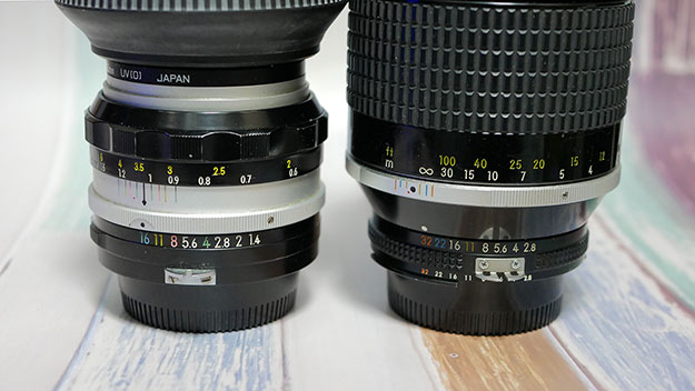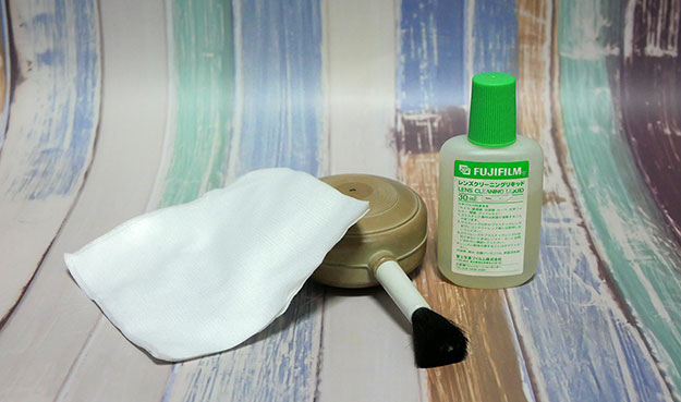 これらのレンズやフィルターを撮影時にはブロアーかレンズクロスできれいにし、自宅等で清掃するときはレンズクリーニングリキッドとレンズクリーニングペーパーを使っている。ティッシュペーパーやタオルはレンズを傷つけるので使用しない。レンズを前から角度を変えて見てみると、指紋などのアブラ汚れやチリなどで汚れているが、専用の道具を使って清掃すると当然だがレンズはとてもキレイになる。オートフォーカスレンズは電子接点が汚れていないかのチェックも必要だ。古いマニュアルレンズはフォーカスリングや絞りがきちんと動くか、粘りは適当かなども確認する。